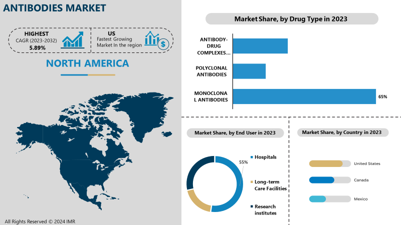 North America is set to lead the antibodies market thanks to its robust healthcare system, significant investment in R&D, and the existence of leading biotech and pharmaceutical companies. The region stands out in healthcare innovations due to its technological expertise and focus on creating new medications, particularly monoclonal antibodies. The increasing senior demographic and the surge in chronic diseases are further driving the demand for antibody-based therapies. North America greatly impacts the expansion of the global antibodies market due to its supportive regulatory framework and reimbursement policies, enhancing market conditions.