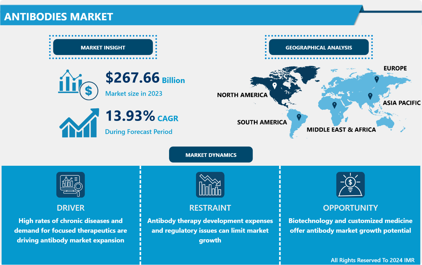 United States, New York, Jan. 31, 2025 (GLOBE NEWSWIRE) — Introspective Market Research is excited to unveil its latest report, ” Antibodies” This in-depth analysis shows that the global Antibodies Market, valued at USD 267.66 billion in 2023, is poised for substantial growth, expected to hit USD 865.62 billion by 2032. This growth trajectory aligns with a strong CAGR of 13.93% during the forecast period from 2024 to 2032.