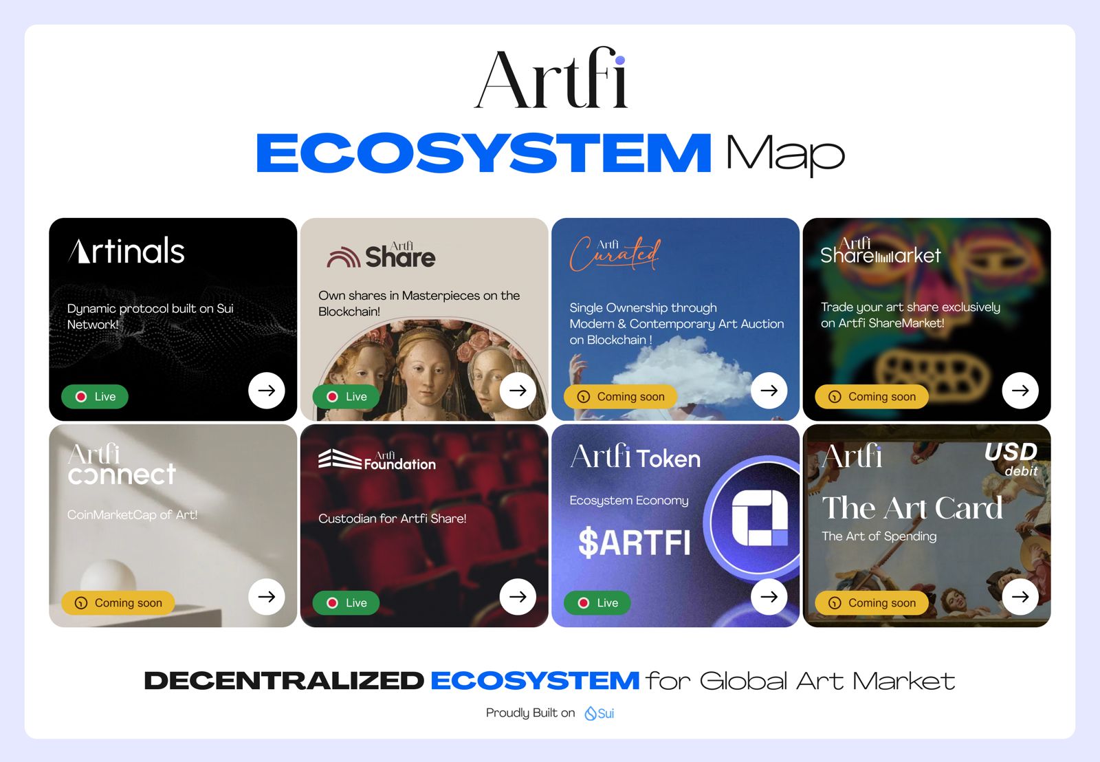 Artfi is transforming the art market by making art investment accessible and inclusive through blockchain technology. With a comprehensive ecosystem built on the Sui blockchain, Artfi offers decentralized tools for fractional and single ownership, trading, and data aggregation. Artfi’s mission is to democratize the art world, combining art with the best of blockchain to open new opportunities for investors, artists, and collectors globally.