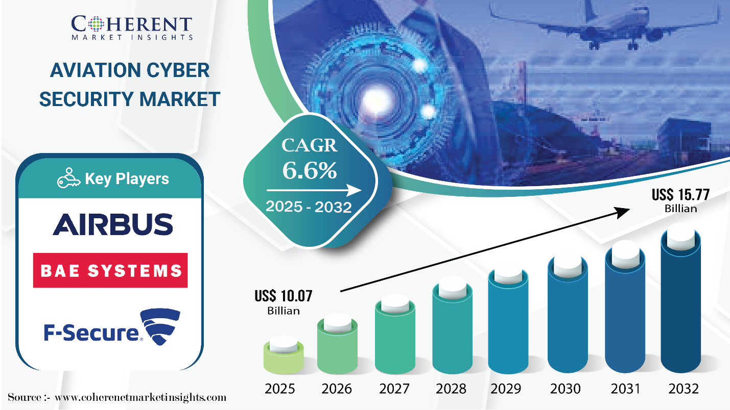 According to Coherent Market Insights (CMI), the global aviation cyber security market size is projected to grow at a CAGR of 6.6% during the assessment period, reaching USD 10.07 Bn in 2025 and USD 15.77 Bn by 2032.
