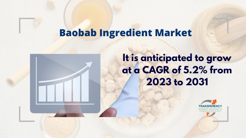 Wilmington, Delaware, Transparency Market Research Inc. – , March 24, 2025 (GLOBE NEWSWIRE) — The global baobab ingredients market was valued at US$ 5.2 billion in 2022 and is expected to reach US$ 8.2 billion by 2031, expanding at a CAGR of 5.2% from 2023 to 2031. This growth is driven by rising demand for functional foods and beverages, along with the increasing popularity of natural and organic cosmetic products. Baobab ingredients, rich in antioxidants, vitamin C, fiber, and essential nutrients, are gaining traction across diverse industries, including food & beverages, nutraceuticals, cosmetics, and pharmaceuticals. The shift toward health-conscious consumption and eco-friendly beauty products is further strengthening market dynamics.