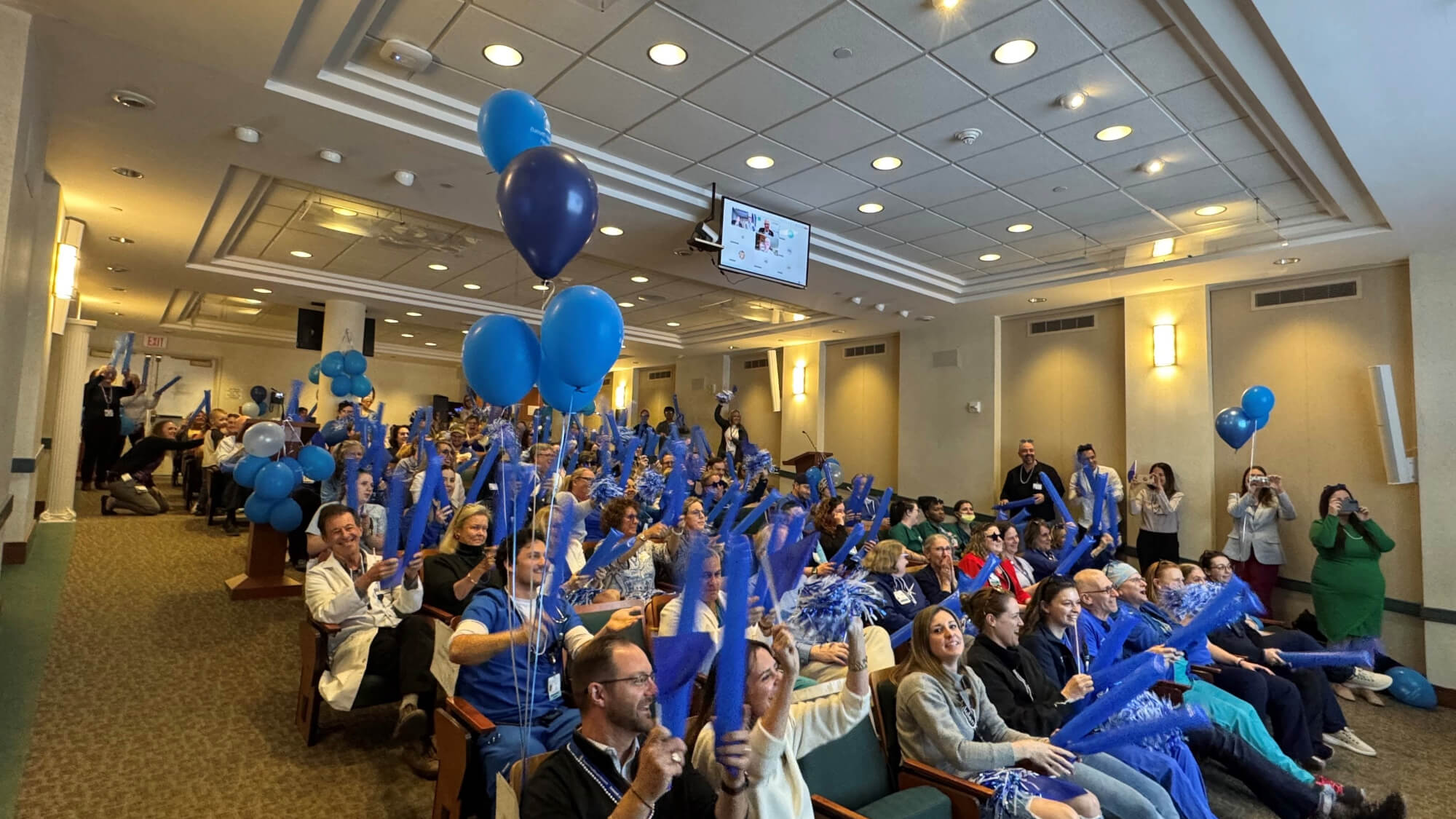 More than 100 employees gather in Bassett Medical Center’s Clark Auditorium on April 23, 2025, to receive news of the hospital’s Magnet designation and celebrate.