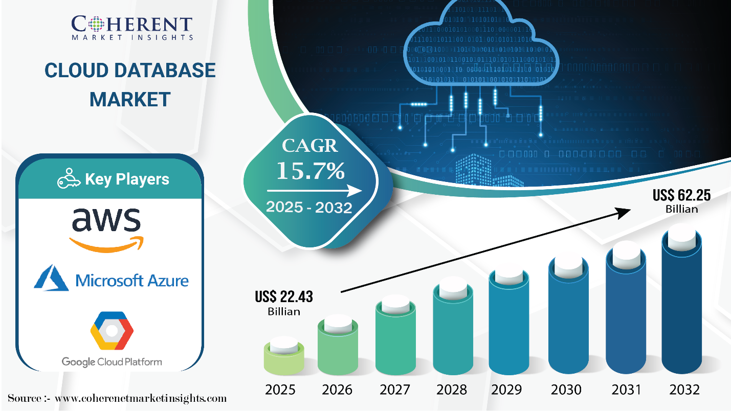 Burlingame, CA, Aug. 07, 2025 (GLOBE NEWSWIRE) — The Global Cloud Database Market is estimated to be valued at USD 22.43 Bn in 2025 and is expected to reach USD 62.25 Bn by 2032, exhibiting a compound annual growth rate (CAGR) of 15.7% from 2025 to 2032. The market is rapidly embracing cloud-based solutions due to their cost-efficiency and scalability. Organizations are increasingly migrating their database workloads to the cloud to lower infrastructure expenses and enhance disaster recovery capabilities. Additionally, global digital transformation efforts are accelerating this shift, further propelling market growth. The rising demand for agile data management solutions is also contributing to the growing adoption of cloud databases.