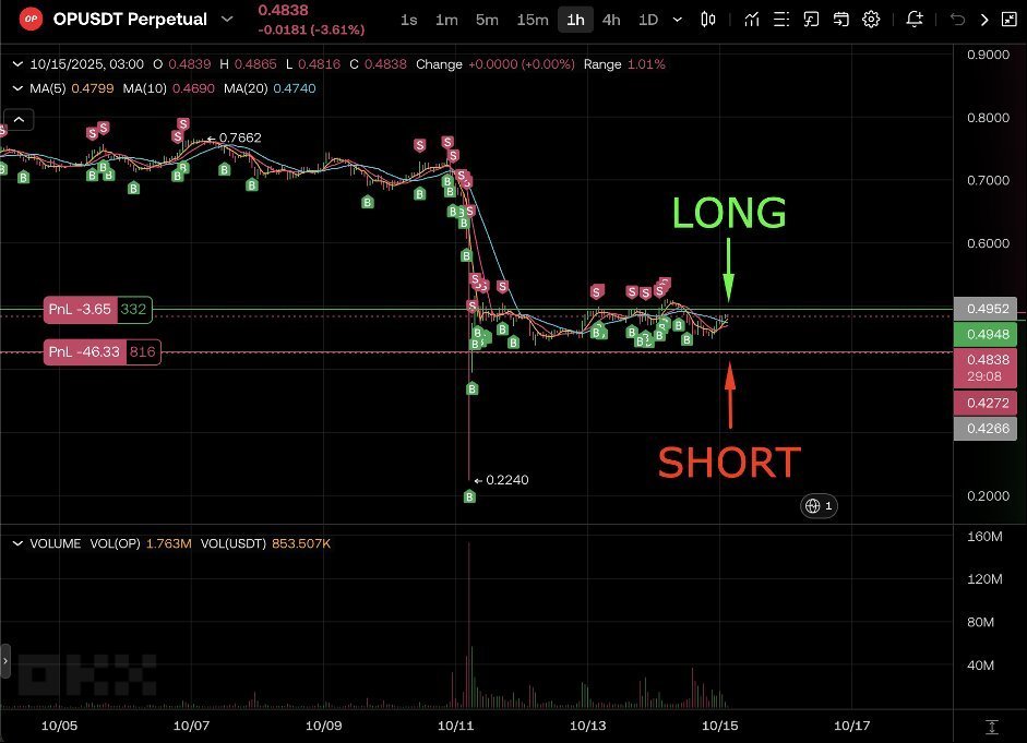 CoinTech2u AI executed Long & Short hedging positions on OPUSDT (OKX Chart)