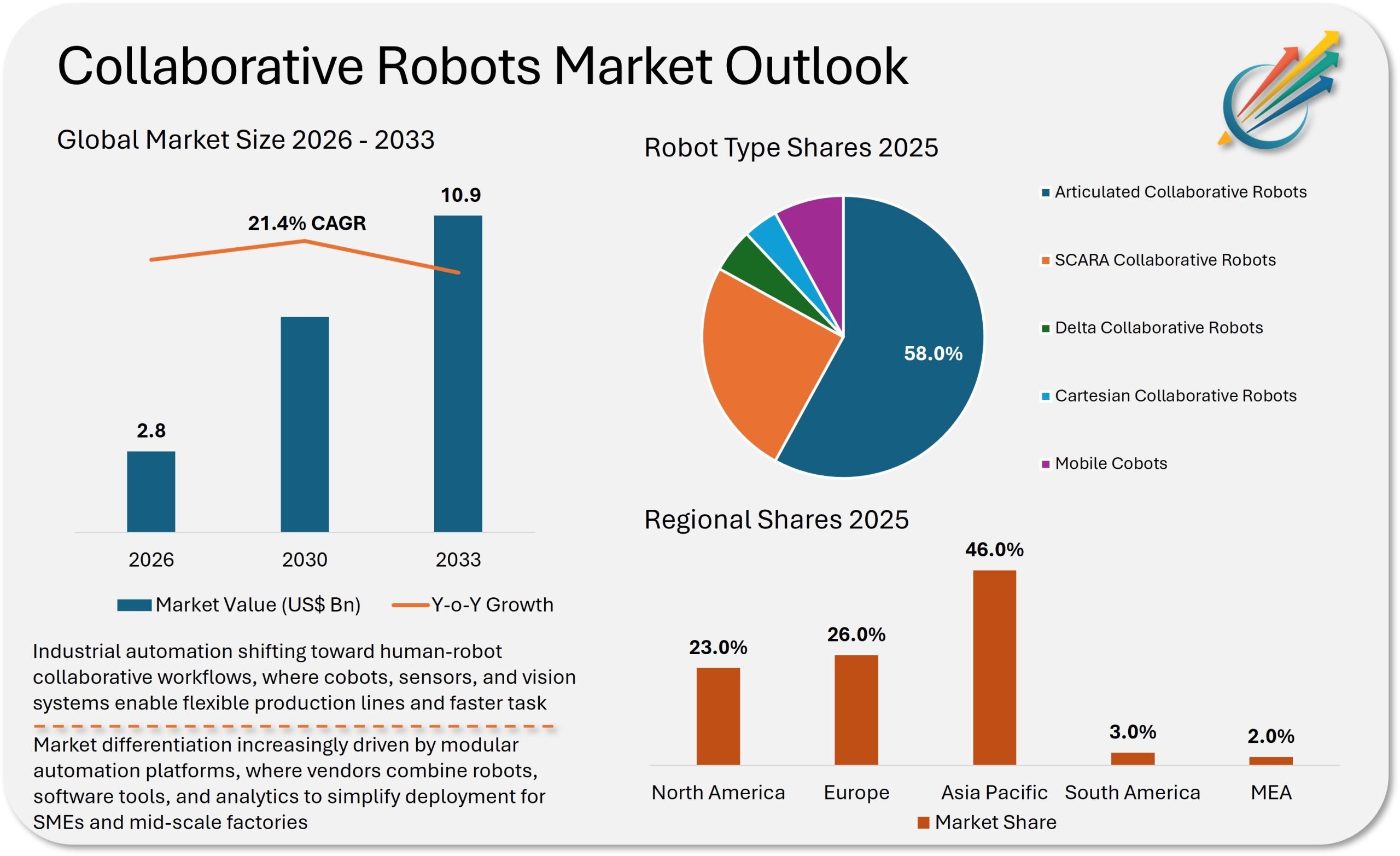 New York, NY, March 16, 2026 (GLOBE NEWSWIRE) — The collaborative robots market is entering a period of accelerated growth as industries increasingly adopt flexible automation solutions designed to work safely alongside human workers. The collaborative robots market is projected to expand from USD 2.8 billion in 2026 to USD 10.9 billion by 2033, registering a CAGR of 21.4% in between the same period. Cobots are designed with advanced sensors, vision systems, safety features that allow direct human interaction without safety cages, making them suitable for dynamic production environments. Collaborative robots market surges as human-safe automation systems boost productivity and flexibility across modern manufacturing lines.