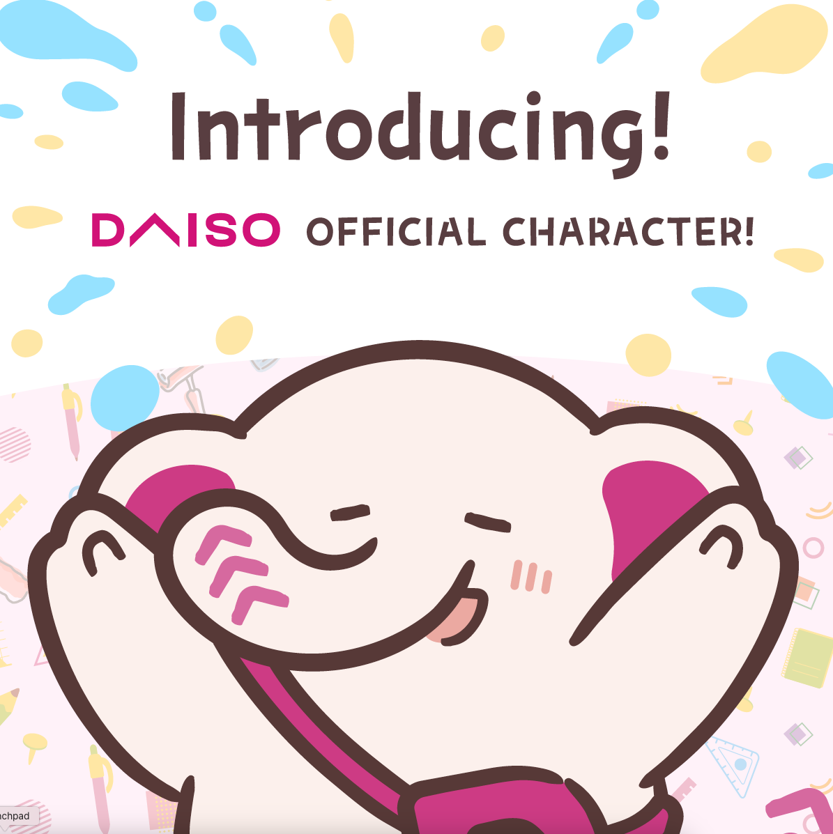 DAIZO is an elephant character selected from internal submissions. Featuring the brand’s signature pink color, its trunk and tail incorporate Daiso Sangyo’s Three Arrows logo. Aiming to convey the excitement and appeal of shopping to customers, DAIZO will be known as “everyone’s friendly Daiso employee” throughout stores and social media.