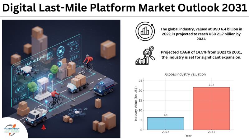 Wilmington, Delaware, Transparency Market Research Inc. –, March 07, 2025 (GLOBE NEWSWIRE) — In 2022, the global digital last-mile platform market was valued at USD 6.4 billion and is projected to reach USD 21.7 billion by 2031, growing at a CAGR of 14.5%. Key factors influencing this growth include increased demand for same-day deliveries, integration of AI and IoT in logistics, and the rise of autonomous delivery solutions. The Digital Last-Mile Platform Industry is experiencing rapid growth, driven by e-commerce expansion, advancements in AI-driven logistics, and rising consumer expectations for faster and more flexible deliveries.