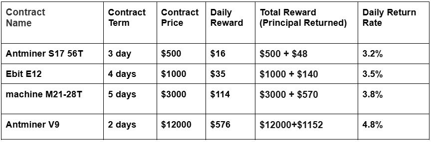 Detailed mining contracts from DNMiner: Offering flexible terms, clear pricing, and daily rewards for top-tier mining rigs, including Antminer, Ebit,