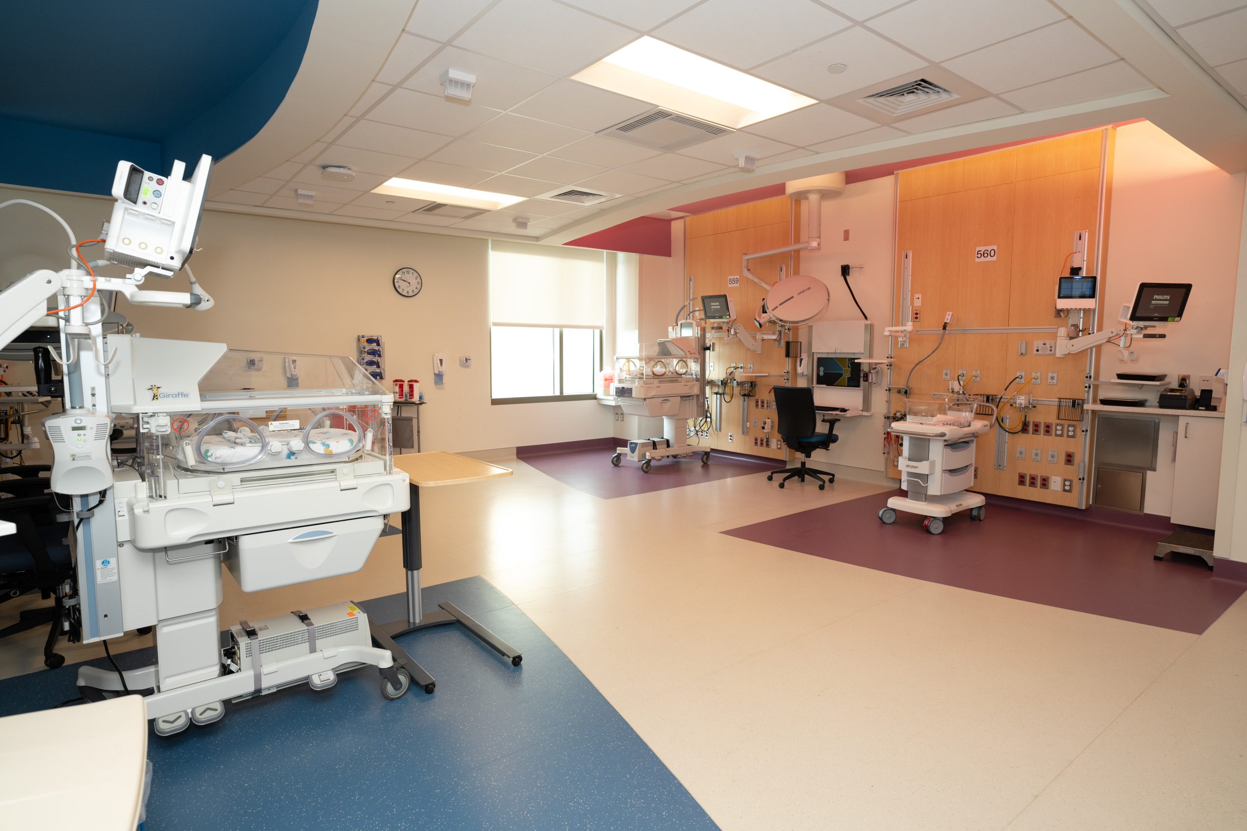 The 26,000-square-foot NICU, located on the fifth floor of Driscoll’s Pavilion, features a hybrid room model designed to enhance specialized care. The unit includes 18 private patient rooms, three twin rooms, and nine four-bed open bay rooms, ensuring a balance of critical care and family-centered comfort.