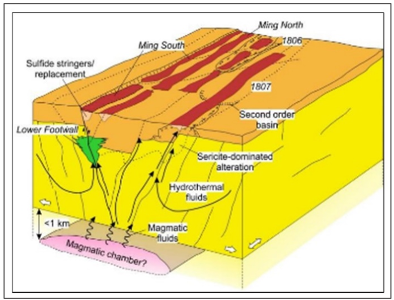 - Metal equivalents for the Mineral Resource Estimates have been calculated at a copper price of US$8,750/t, gold price of US$2,500/oz and silver price of US$25/oz. Metallurgical recoveries have been set at 95% for copper and 85% for both gold and silver. These assumptions are made of the basis of historical production at the Ming Mine and additional metallurgical test work. Copper equivalent was calculated based on the formula: CuEq(%) = Cu(%) + (Au(g/t) x 0.82190) + (Ag(g/t) x 0.00822).