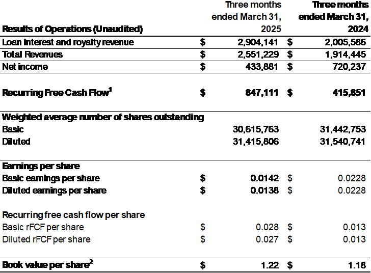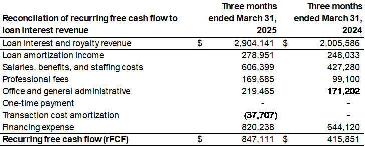 Recurring Free Cash Flow is an internally defined, non-IFRS measure calculated as loan interest and royalty income less loan amortization income, one-time payments, salaries, professional fees, office and general administrative expenses, and financing expenses.