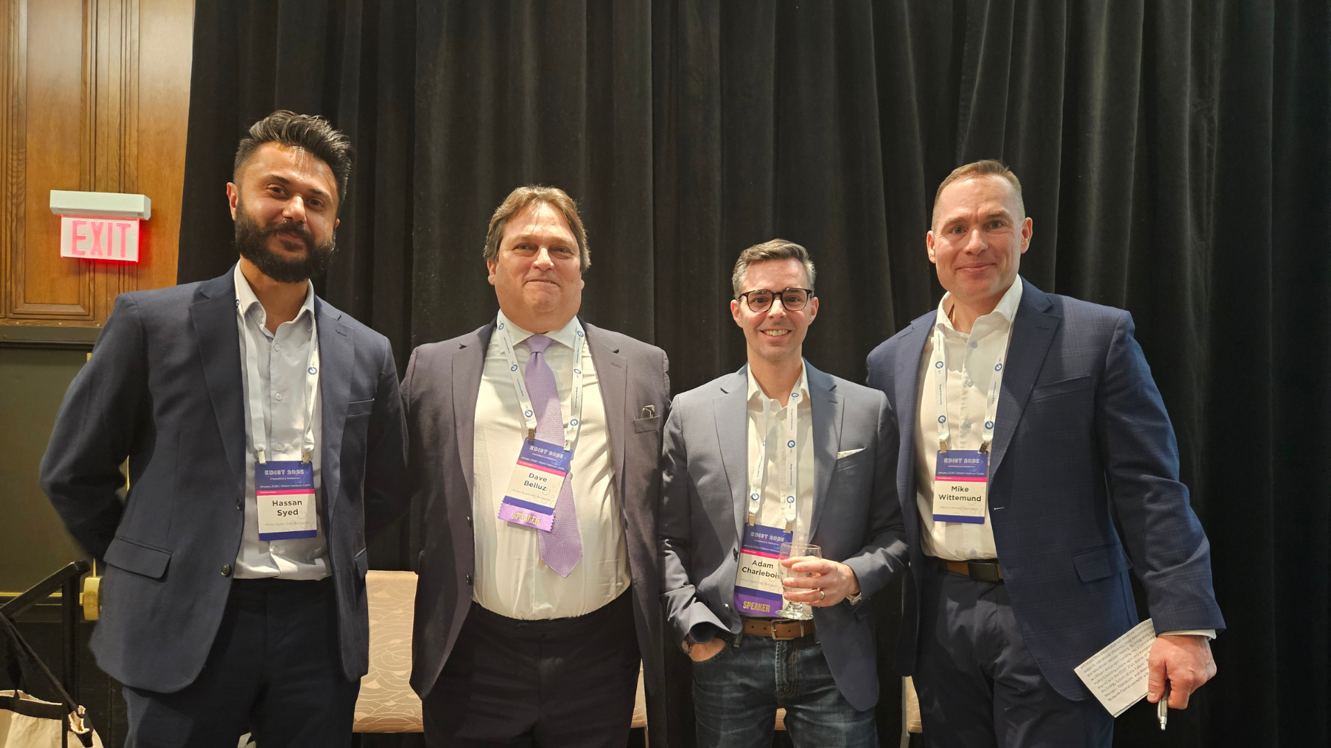 Milton Hydro staff from left, Hassan Syed, VP Distribution Services, Dave Belluz, Operations Manager, Adam Charlebois, Project Coordinator, & Session Host Mike Wittemund, VP Lines & Operations with Alectra