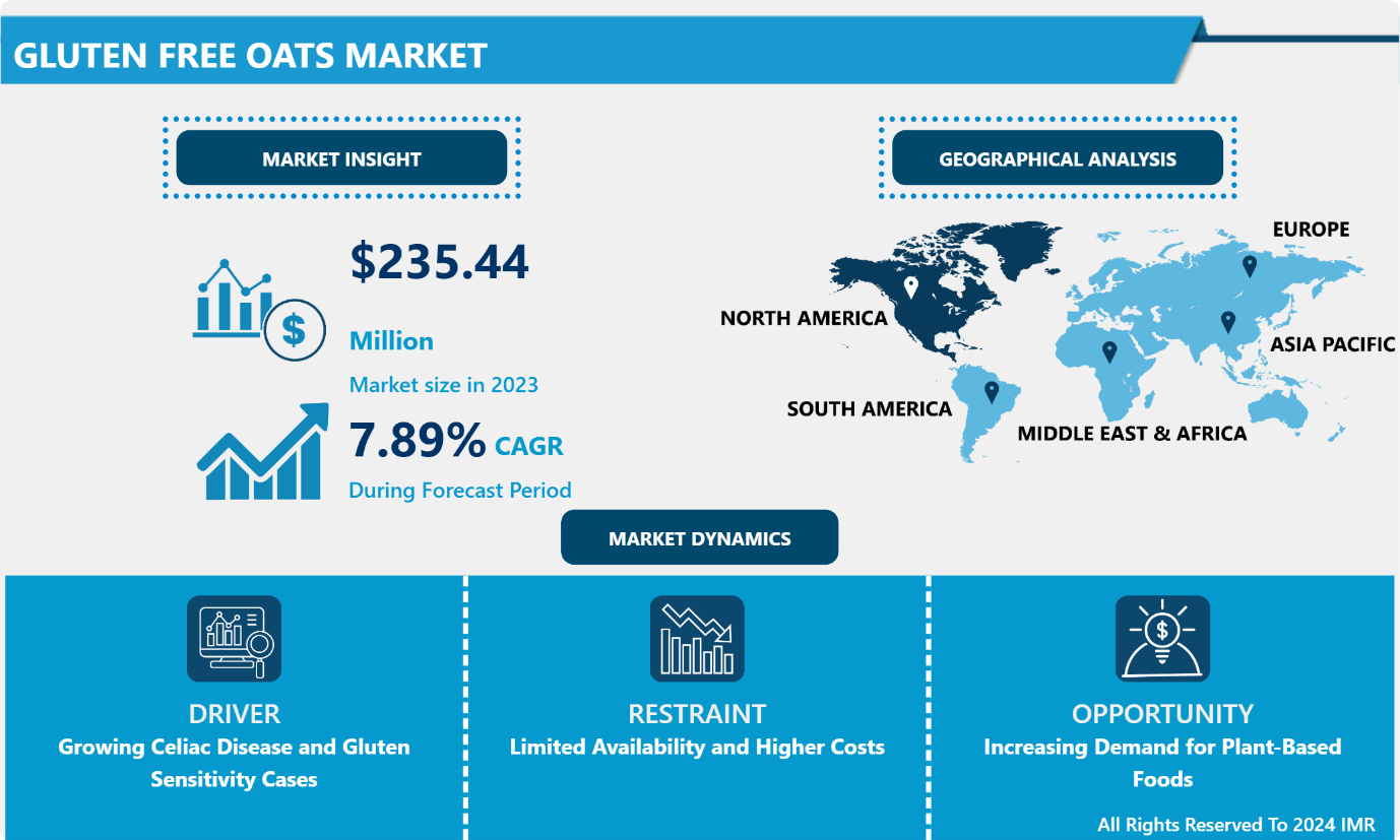 Wilminton, Delaware,, Jan. 28, 2025 (GLOBE NEWSWIRE) — Introspective Market Research is thrilled to announce the statement of its newest report, “Gluten Free Oats Market.” This inclusive analysis discloses that the global Gluten Free Oats market, valued at USD 235.44 Million in 2023, is on a course of significant growth, predictable to reach USD 466.35 Million by 2032. This rising determination corresponds to a robust CAGR of 7.89% over the estimate period from 2024 to 2032.