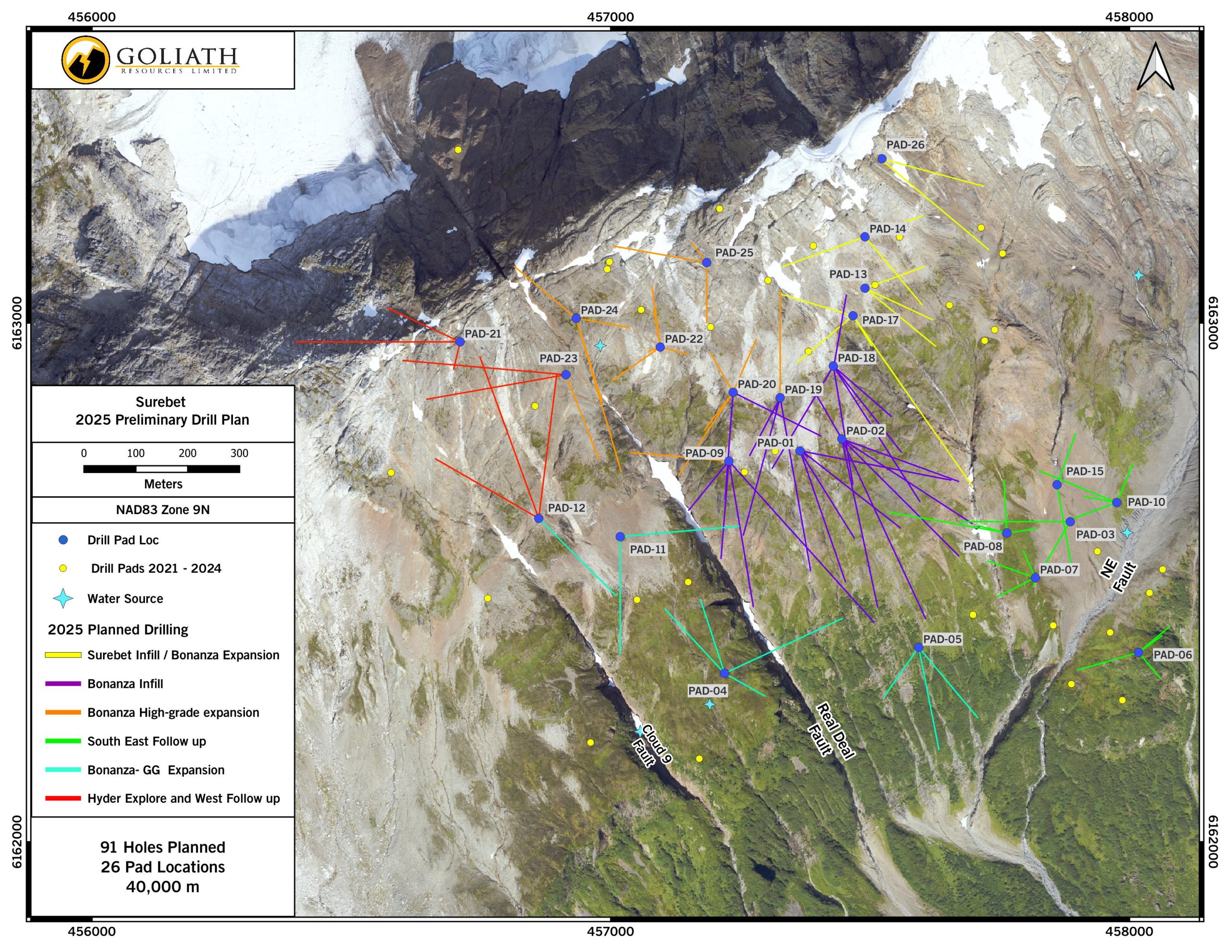 - Goliath is embarking on its largest drill program to date that is 100% focused on the extensive Surebet high-grade gold discovery totaling 40,000 meters with 9 rigs based on the positive results from the 2024 drill season which has greatly improved the understanding of this large mineralized system that remains open for expansion in all directions.