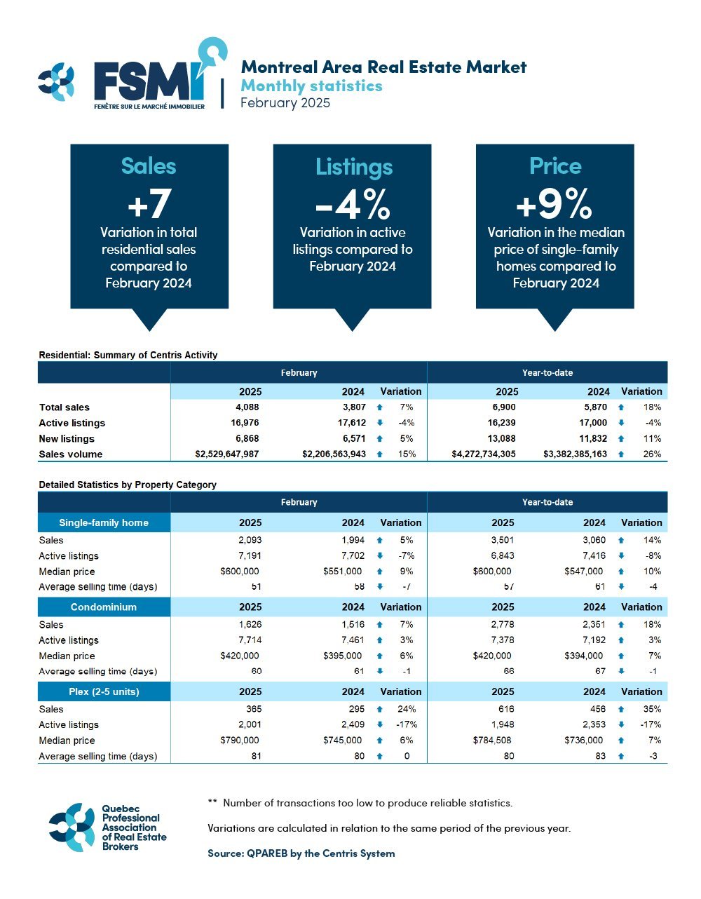 L’ÎLE-DES-SOEURS, Quebec, March 07, 2025 (GLOBE NEWSWIRE) — The Quebec Professional Association of Real Estate Brokers (QPAREB) has just released its residential real estate market statistics for the month of February 2025. The most recent market statistics for the Montreal Census Metropolitan Area (CMA) are based on the real estate brokers’ Centris provincial database.