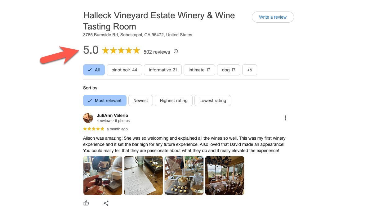 Of the more than 600 licensed wine-pouring establishments in Sonoma County, just five have more than 500 Google ratings, and Halleck Vineyard stands alone with a perfect 5.0-star average. In Napa Valley, where mega wineries rule, only eight wineries have surpassed the 500 ratings mark—and none have preserved a flawless five-star average.