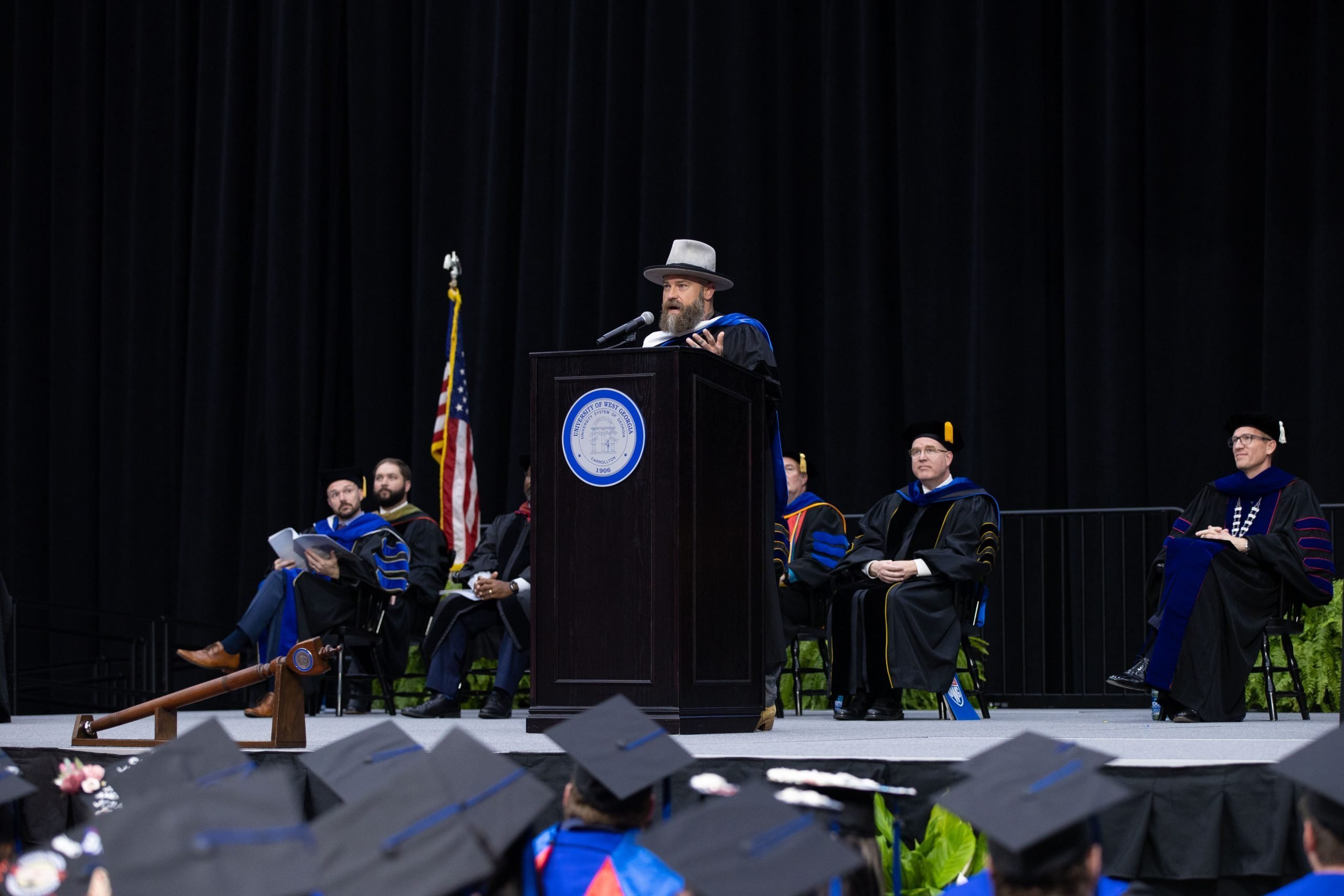 Musician and singer-songwriter Zac Brown speaks to graduates at the University of West Georgia after receiving an honorary degree during the institution's Spring Commencement ceremony Saturday.