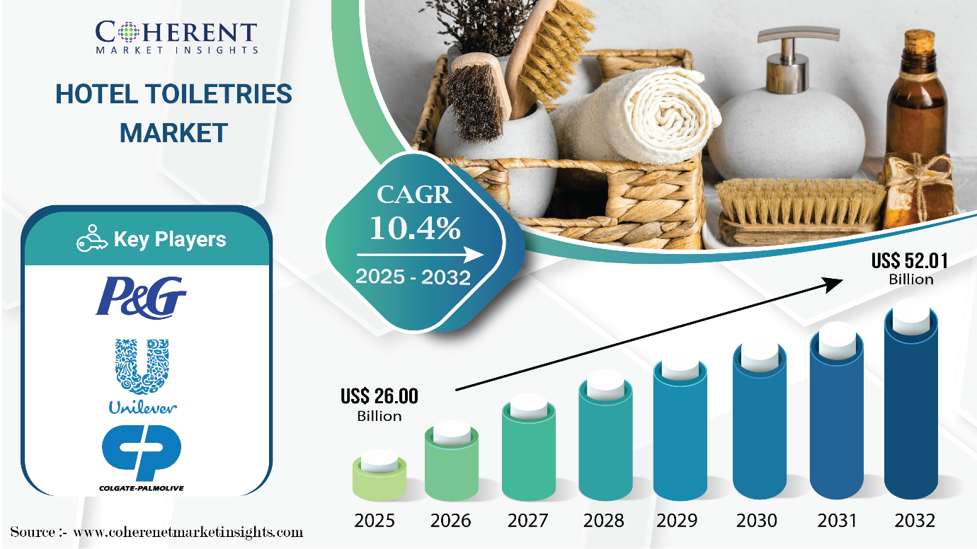Burlingame, CA, May 10, 2025 (GLOBE NEWSWIRE) — According to Coherent Market Insights, The global hotel toiletries market is projected to be valued at USD 26.00 billion in 2025 and reach USD 52.01 billion by 2032, growing at a CAGR of 5.9% according to a new report by Coherent Market Insights. Growth in global tourism and a shift toward premium toiletry offerings in hotels are boosting demand for upscale personal care products in the hospitality sector.