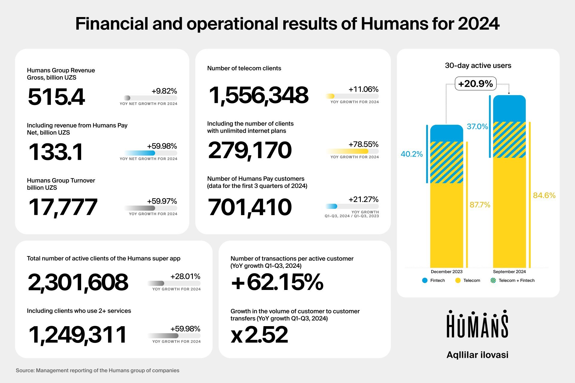 Humans Group recorded significant growth across all key metrics: turnover, revenue, and customer numbers. The active user base of its super app ecosystem grew to over 2.3 million people by the end of 2024, a 28% year-on-year increase.
