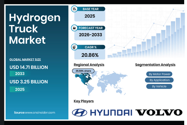 Austin, Feb. 02, 2026 (GLOBE NEWSWIRE) — According to SNS Insider, The Hydrogen Truck Market Size is estimated at USD 3.25 billion in 2025 and is expected to reach USD 14.71 billion by 2033, growing at a CAGR of 20.86% over 2026-2033. The market for hydrogen trucks is expanding quickly as a result of escalating environmental restrictions, the need for zero-emission transportation, and the drive for sustainable logistics solutions.