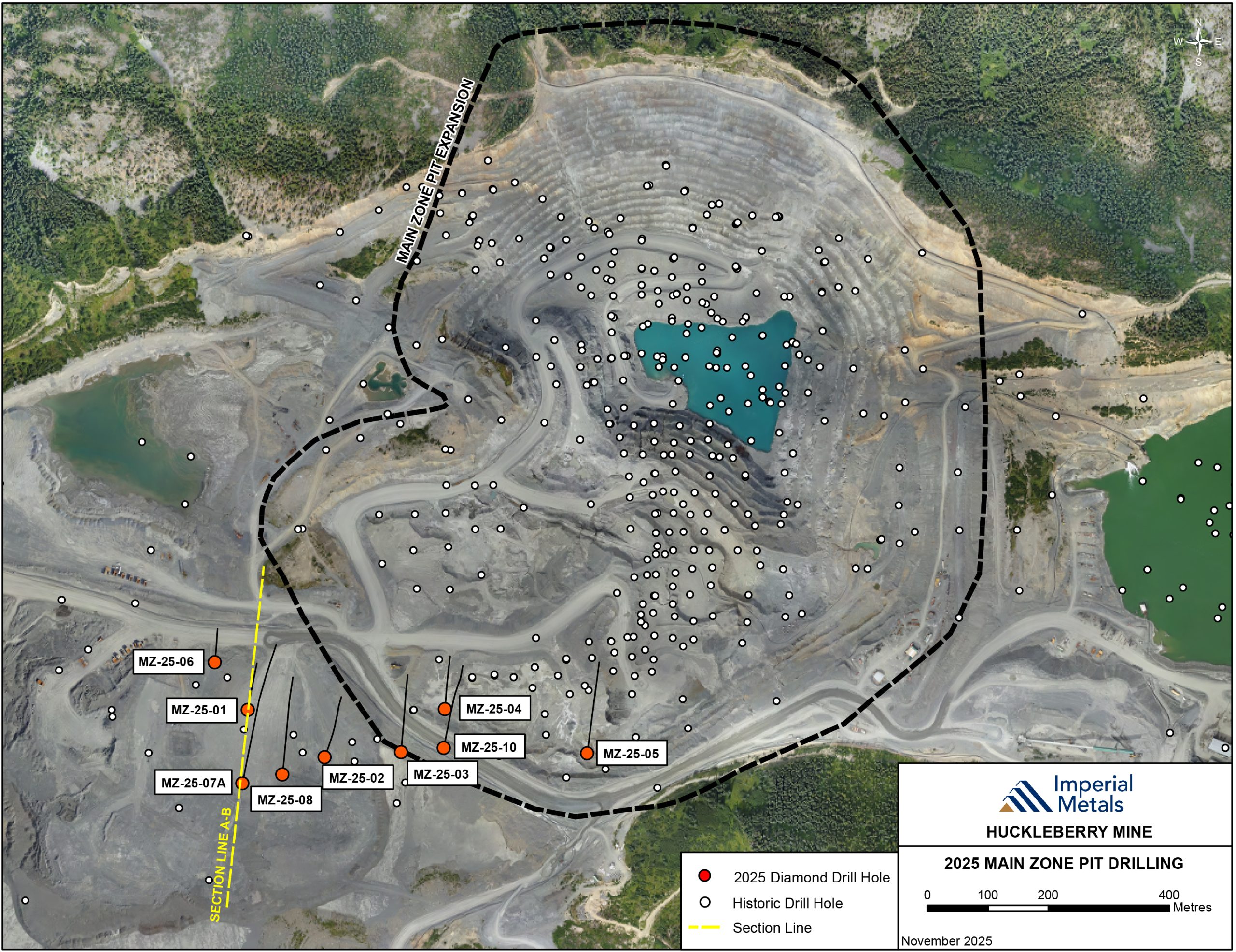 Figure 1: Location Plan Map showing the Huckleberry Main Zone Expansion Pit relative to the new 2025 diamond drill holes. Also shown is the section line A – B’ which controls the location of Figure 2.