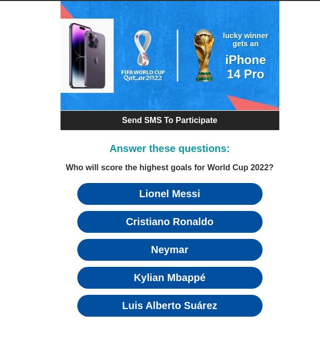 The researchers found fake betting pages, where fans are asked to send an SMS with the winning team or best player. Thus, the victim’s number gets added to a database so scammers can contact the victim in the future with other schemes, or sell their data on the darknet.