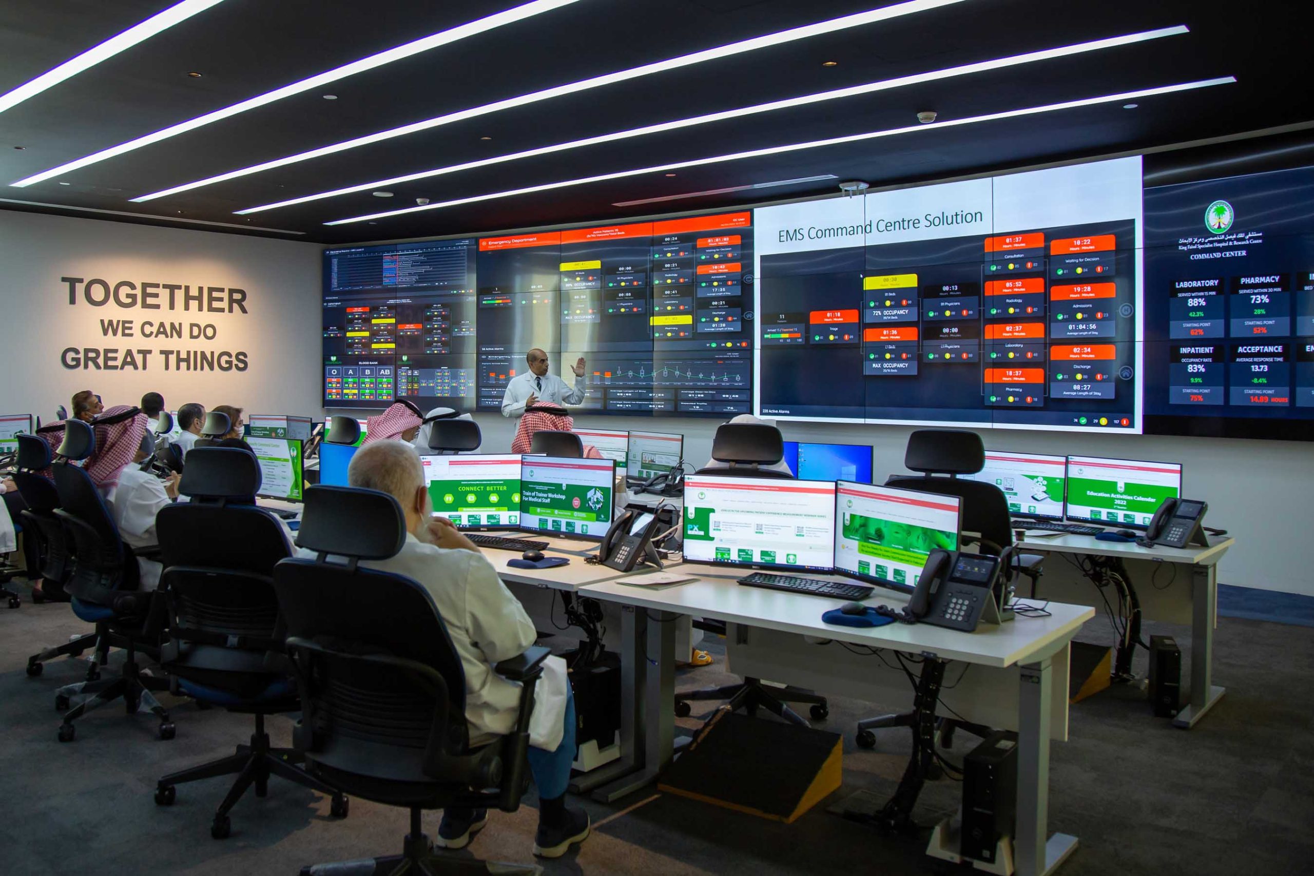 The Patient Flow & Capacity Command Centre enhances operational efficiency by applying AI to forecast demand, manage resources, and monitor patient flow in real time. Since its launch, the Centre has completed over 170,000 interventions, cutting bed wait times from 32 to 6 hours and reducing emergency delays by 14%. In 2024 alone, the hospital received over 46,000 new patients and processed more than 79,000 referrals. Smart tools, such as the Noor robot, enhance the patient experience by providing real-time assistance and improving access to services.
