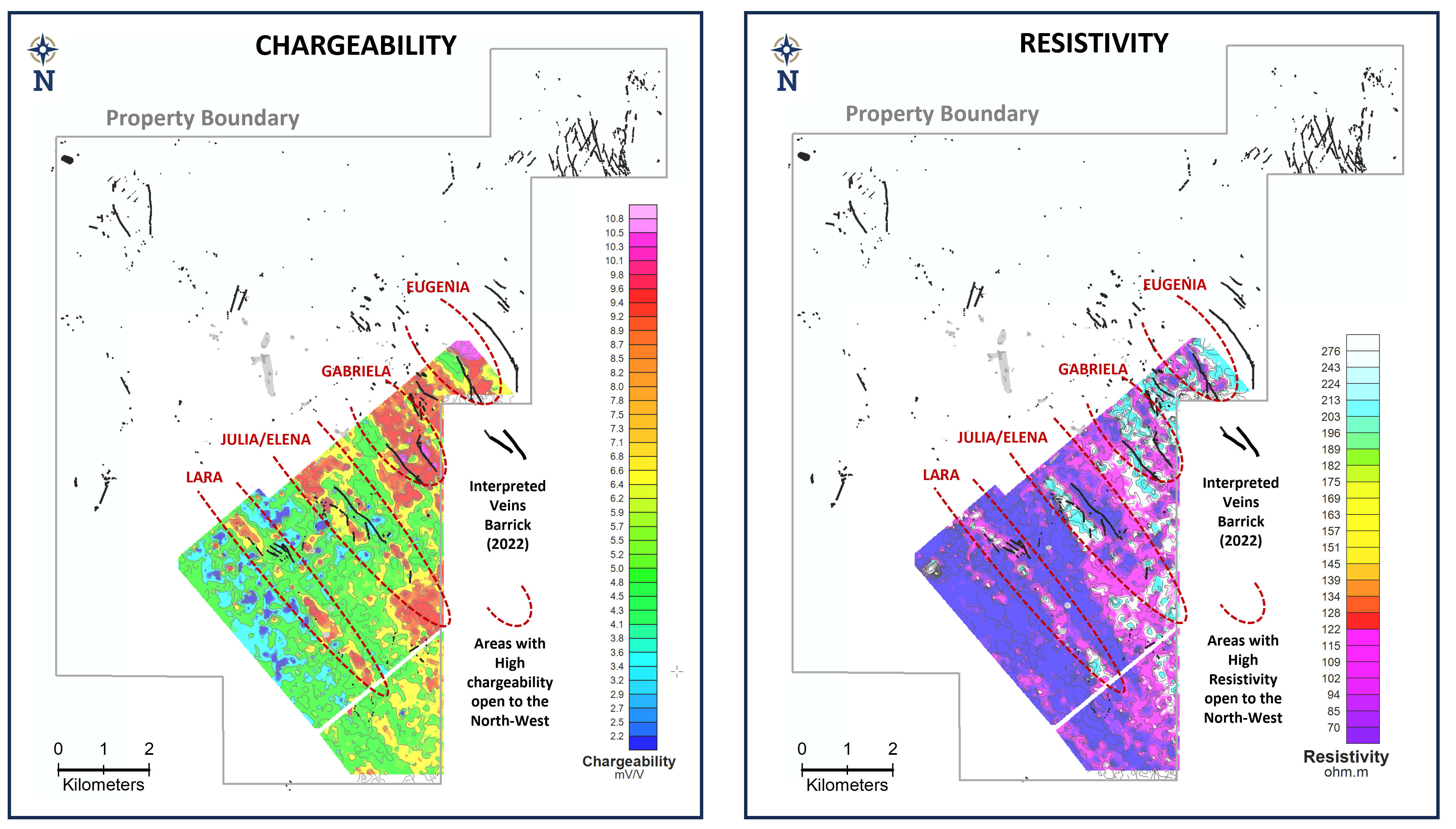 The survey highlights pronounced chargeability and resistivity anomalies, spatially associated with historical drill targets identified by Barrick, and there is a strong correlation of chargeability anomalies with previously mapped mineralized structures. Importantly the anomalous geophysical trends are open to the northwest (Figure 1).