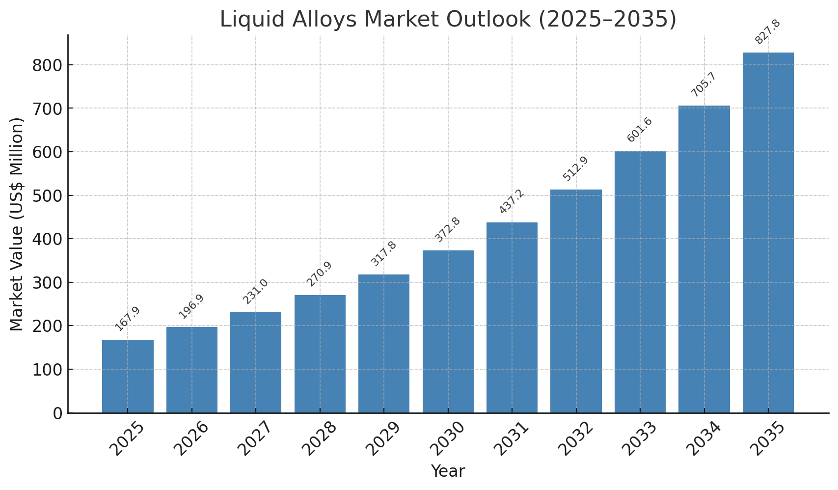Wilmington, Delaware, Transparency Market Research, Inc. –, March 21, 2025 (GLOBE NEWSWIRE) — Breakthroughs in materials science and the demand for high-performance metals are accelerating growth in the Liquid Alloys Market Size. Valued at US$ 143.1 million in 2024, the global industry is projected to expand at a CAGR of 17.3%, reaching US$ 822.2 million by 2035. Known for their superior fluidity, strength, and conductivity, liquid alloys are gaining traction across electronics, aerospace, and additive manufacturing, offering next-gen solutions for complex design and thermal management challenges.