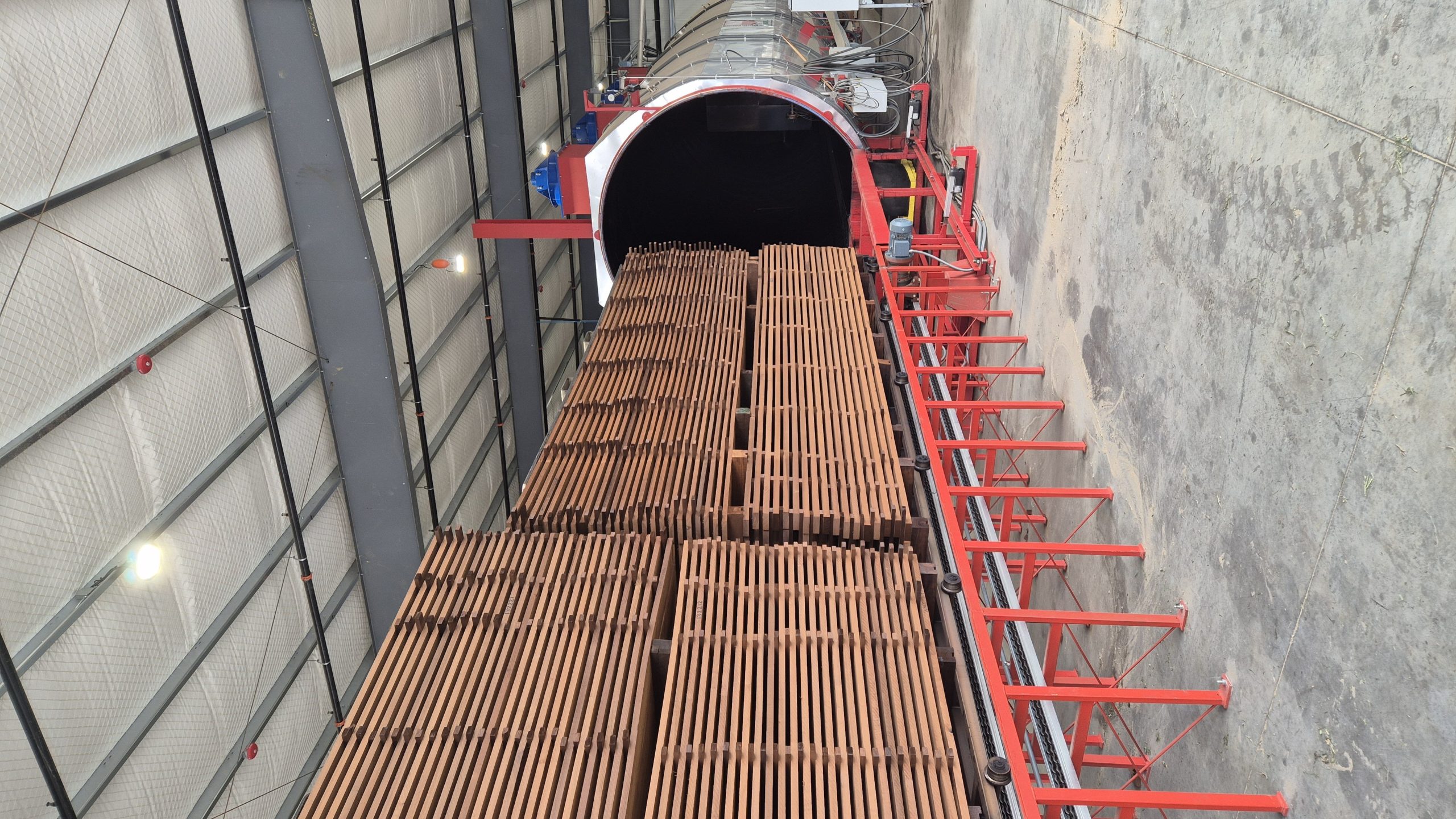 • The first kiln load of thermally modified hardwood is ready for planing at Lunawood LLC mill.
