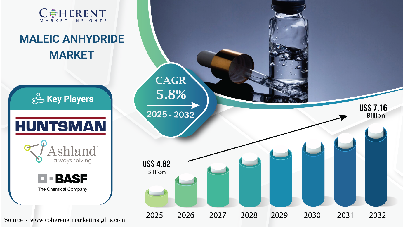 According to Coherent Market Insights (CMI), the maleic anhydride market size is forecast to total USD 4.82 Bn in 2025 and USD 7.16 Bn by 2032.