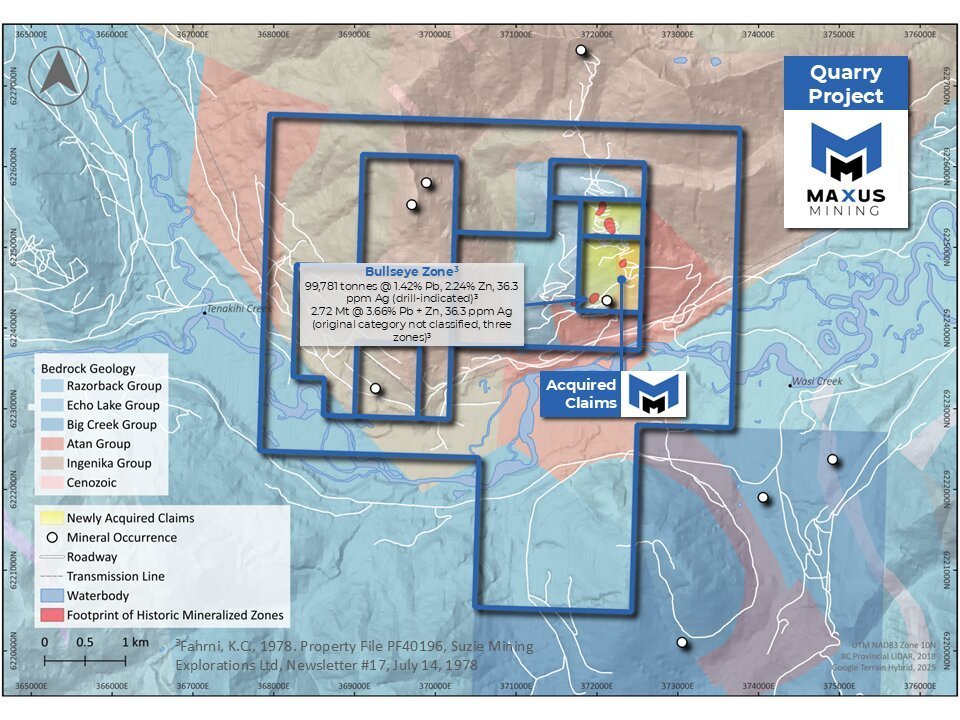 VANCOUVER, British Columbia, Sept. 26, 2025 (GLOBE NEWSWIRE) — Maxus Mining Inc. (“Maxus” or the “Company”) (CSE: MAXM | FRA: R7V), is pleased to announce it has entered into a Mineral Claims Purchase Agreement dated September 26, 2025 (the “Agreement”) with John Nick Bakus (the “Seller”) an arms-length third party, to acquire a 100% interest in the Beveley Property (the “Property”) located in northern British Columbia, Canada. The Property consists of two mineral claims comprising 108 hectares within the boundaries of the Company’s Quarry Project (Please see Figure 1). This strategic acquisition allows for consolidation of the Quarry Project area highlighted by the addition of known critical metal mineralization and a historical NI 43-101 non-compliant mineral resource.