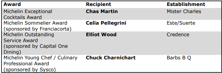 In addition to the Bib Gourmands and Stars, the Guide announced four Special Awards: