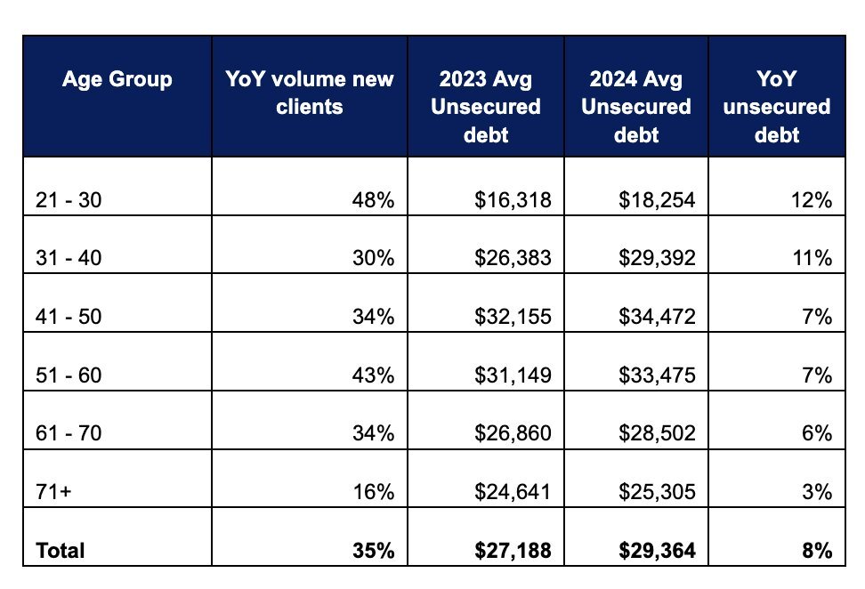 Age Group YoY volume new clients 2023 Avg Unsecured debt 2024 Avg Unsecured debt YoY unsecured debt