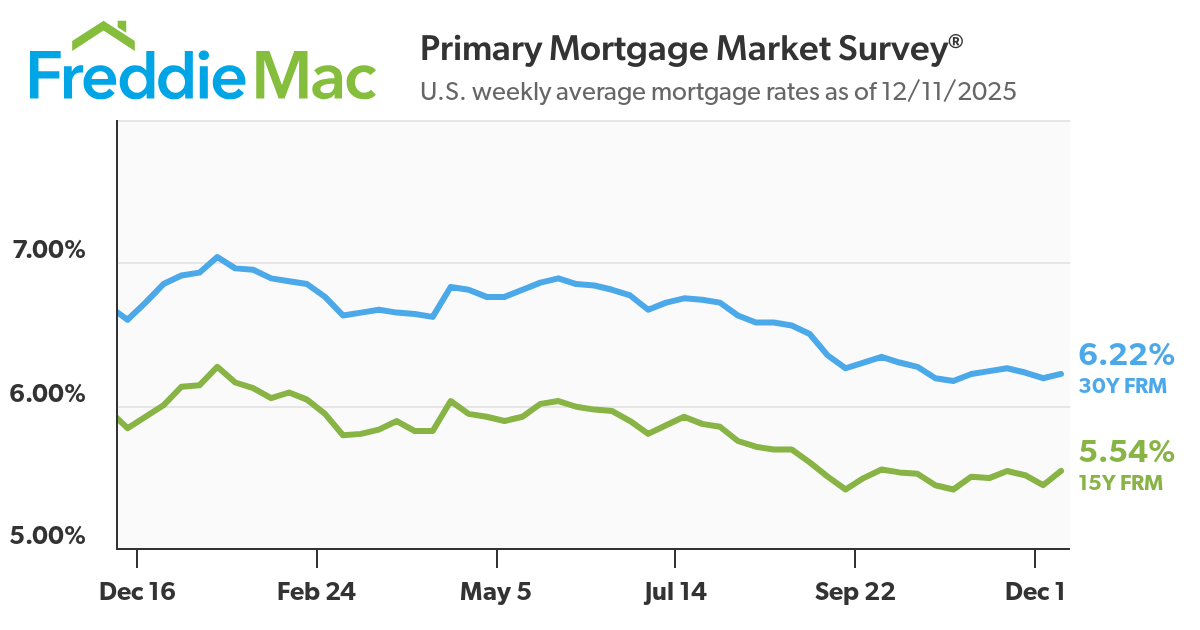 • The 30-year FRM averaged 6.22% as of December 11, 2025, up from last week when it averaged 6.19%. A year ago at this time, the 30-year FRM averaged 6.60%.