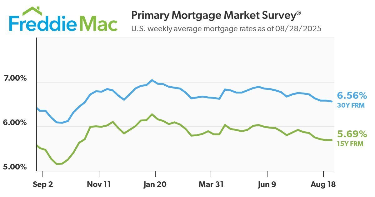 MCLEAN, Va., Aug. 28, 2025 (GLOBE NEWSWIRE) — Freddie Mac (OTCQB: FMCC) today released the results of its Primary Mortgage Market Survey® (PMMS®), showing the 30-year fixed-rate mortgage (FRM) averaged 6.56%.