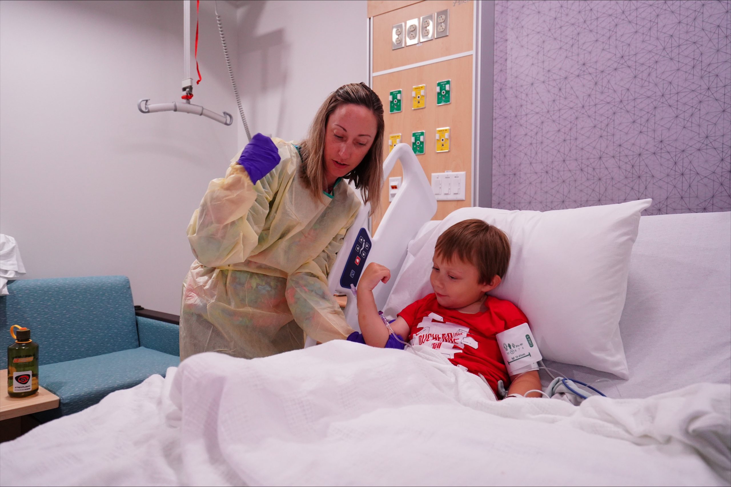 Karson was at CHKD to receive a newly approved gene therapy for Duchenne muscular dystrophy, which he was diagnosed with at 20 months of age. Duchenne is a devastating genetic illness that causes progressive muscular wasting. Affecting mostly males, the disease causes life-threatening heart and respiratory problems as it advances. “Patients usually lose the ability to walk in their early teens and generally succumb to the illness before age 30,” said Dr. Crystal Proud, Karson’s pediatric neurologist at CHKD.