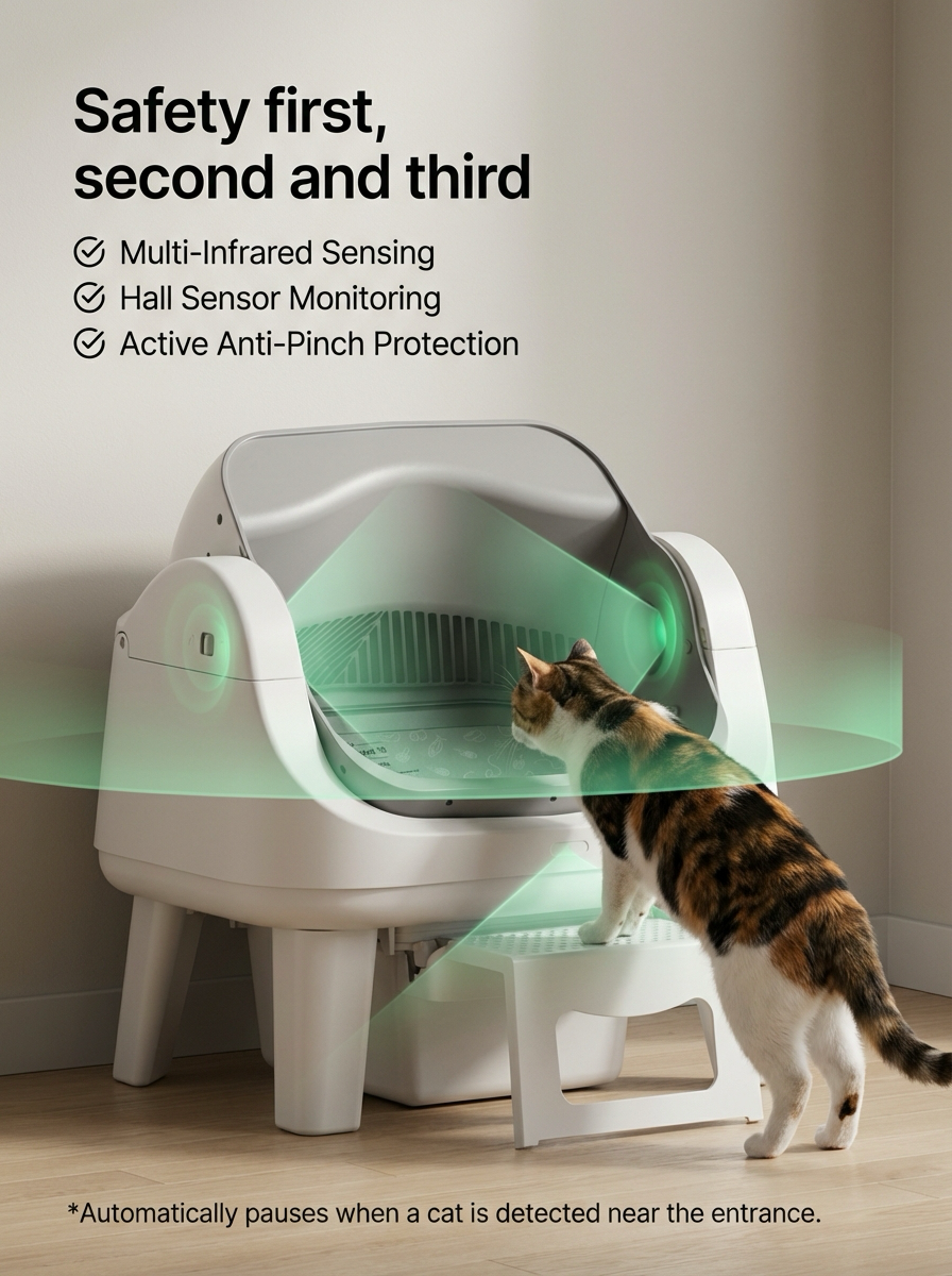 - 11-Sensor Safety System: Seven pairs of infrared sensors and four Hall sensors monitor movement and position in real time, which gives better performance on cat movements detection. The cleaning cycle pauses instantly if a cat approaches, hesitates, or reaches inside—even mid-cycle.
