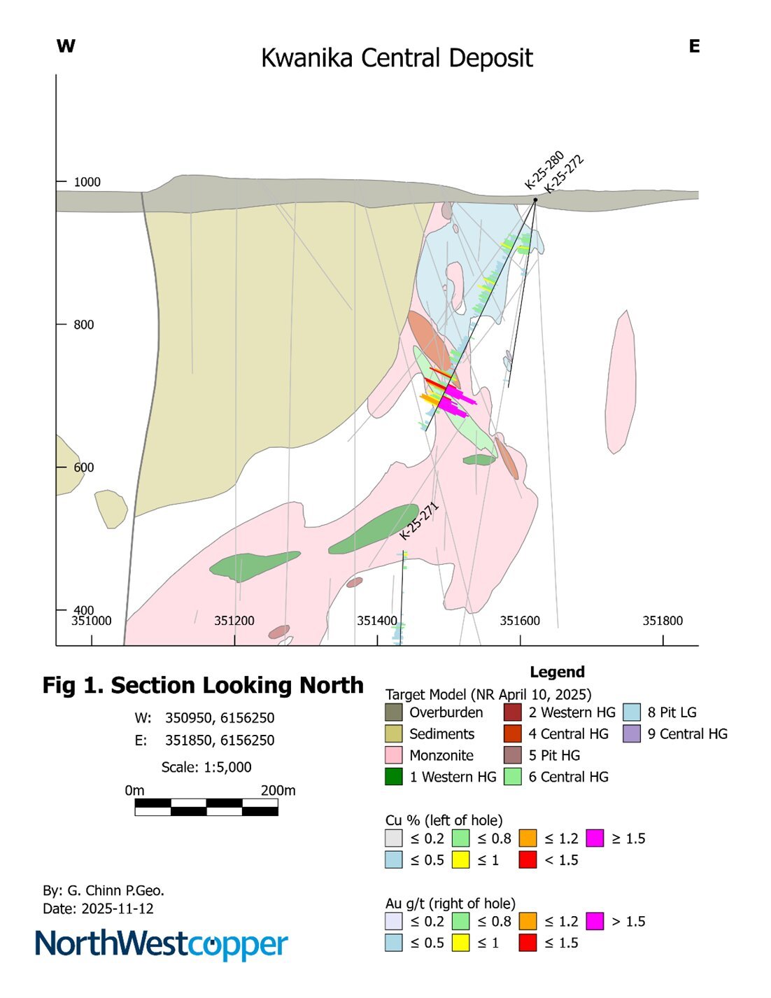 TORONTO, Nov. 12, 2025 (GLOBE NEWSWIRE) — NorthWest Copper Corp. (“NorthWest” or the “Company”) (TSX-V: NWST) is pleased to announce standout assay results from the fourth drill hole of its 2025 drilling program at the Company’s 100% owned Kwanika project in British Columbia. Drill hole K-25-280 successfully intersected both the Pit and Central copper-gold zones, highlighted by an exceptional intercept of 36 metres grading 0.80 % Cu, 3.21 g/t Au (3.67% copper equivalent1, “CuEq”) in the Central Zone. This drill hole returned results that exceeded expectations in both grade and thickness.