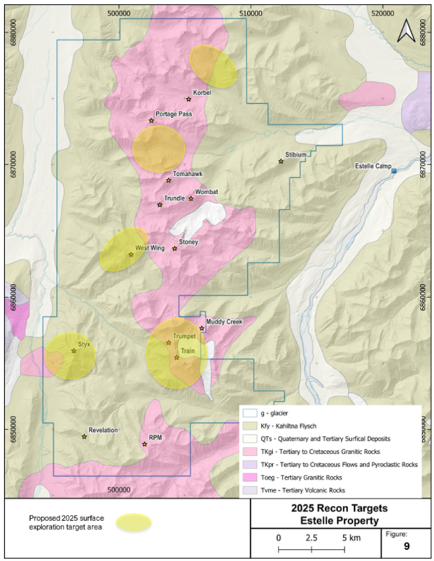 An extensive regional surface exploration program will run in parallel with drilling, with field teams conducting geological mapping, geochemical sampling, and target delineation across the broader Estelle Project area. This work will specifically focus on identifying and advancing new high-priority prospects to support future resource growth. High-priority areas will include adding coverage north of Korbel, increasing sample density between Portage Pass and Tomahawk, and follow-up mapping and sampling at West Wing, Styx, and the greater Train area (Figure 9). Korbel, West Wing, and Styx all offer a good opportunity to discover increased mineralization near the intrusive/hornfels (Kahiltna Flysch) contacts. In addition, infill sampling will be conducted at RPM and Styx.
