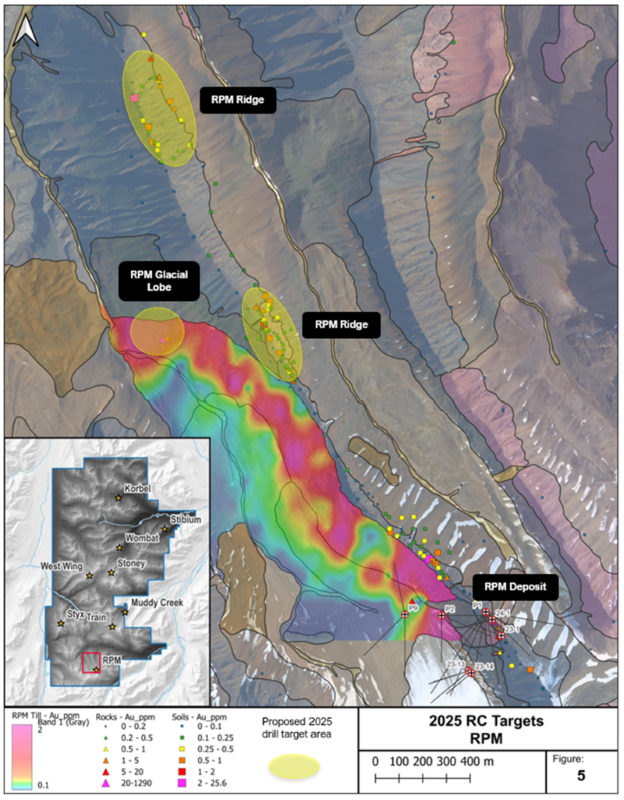 3.  Reverse-circulation (RC) drilling in the RPM glacial debris lobe area, where surface sampling in 2024 identified rock samples up to 52.3 g/t Au and till samples averaging 1.1 g/t Au over a 1.7 km strike length (ASX Announcement: 3 February 2025 and Figure 5).