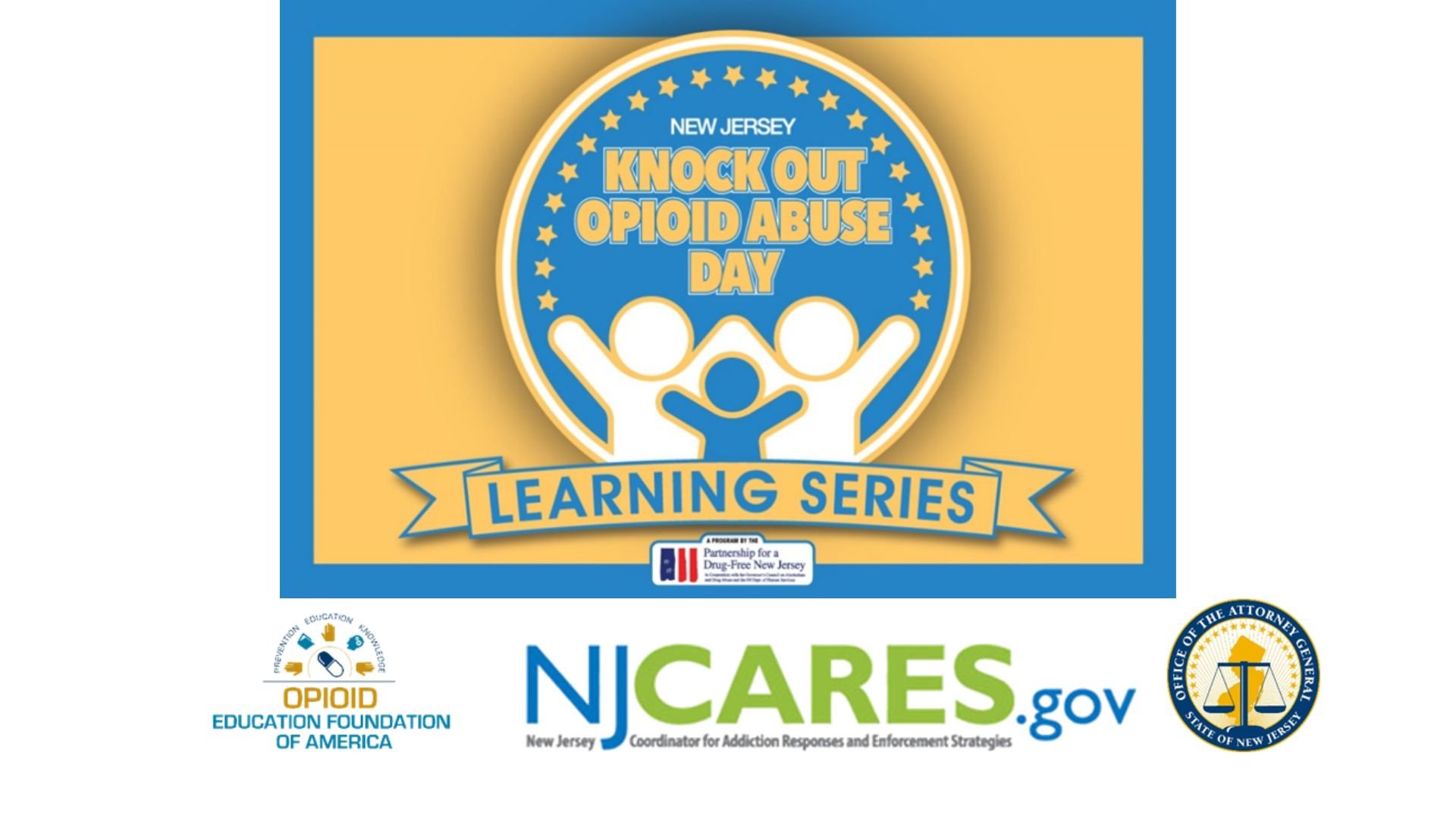 The Knock Out Opioid Abuse Day Learning Series began in 2020 in the midst of the COVID-19 pandemic to educate New Jersey residents on various aspects of the opioid epidemic and its impact on New Jersey and the nation. It is a branch of PDFNJ’s Knock Out Opioid Abuse Day statewide initiative, which has been held annually on October 6 since 2016 to educate residents and prescribers on the risks of prescription opioids and to raise awareness of the opioid crisis throughout the state.
