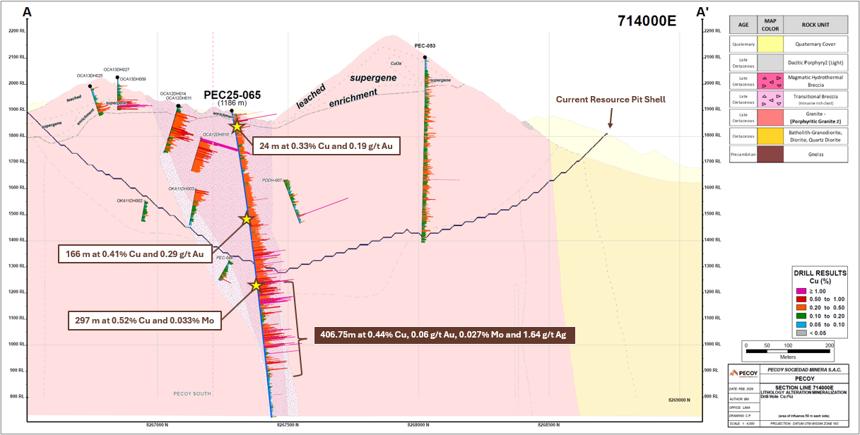 VANCOUVER, British Columbia, Feb. 19, 2026 (GLOBE NEWSWIRE) — Pecoy Copper Corp. (“Pecoy Copper” or the “Company”) (TSXV: PCU; FSE: D5E; OTCQB: PCUUF) is pleased to report initial assay results from its ongoing Phase 1 drill program at its 100% owned Pecoy Project in southern Peru. The Company’s first diamond drill hole, PEC-25-065, intersected approximately 1,186 metres of continuous copper-gold-molybdenum-silver mineralization, beginning near surface. This hole confirms the scale and vertical continuity of the South Breccia system and significantly extends the mineralization below the current resource pit shell.