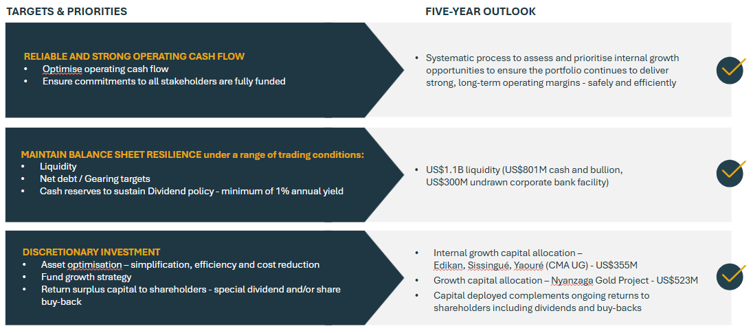 Perseus is in a strong financial position, with a resilient balance sheet and an operational portfolio that continues to safely and efficiently generate reliable operational cash flow. This allows the Company to look to deploy operating cashflow to shareholders and other stakeholders in the business. Figure 2 summarises Perseus’s capital allocation priorities.