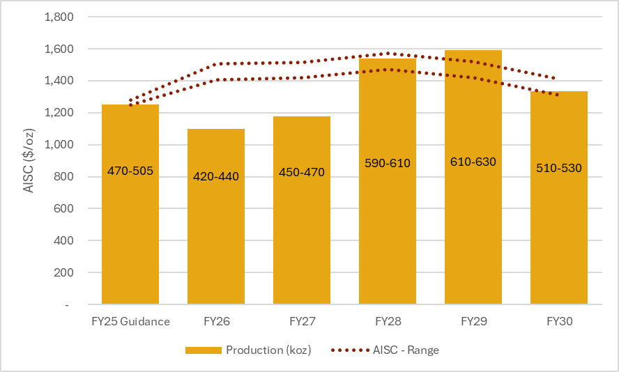 The Company’s weighted average AISC over the five-year outlook is estimated at US$1,400/oz – US$1,500/oz. AISC rises slightly in the first two years, driven by lower production base. In FY28, the integration of lower-margin ore sources into the mine plan contributes to a slight increase in AISC. The portfolio’s diverse production base allows AISC to remain within ±10% of the five-year average on a year-to-year basis.