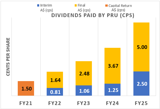 - Final dividend of A$0.05 per share for FY25, making a total dividend for FY25 of A$0.075 per share, 50% more than in FY24. This final dividend equates to a dividend yield of 2.1%3.