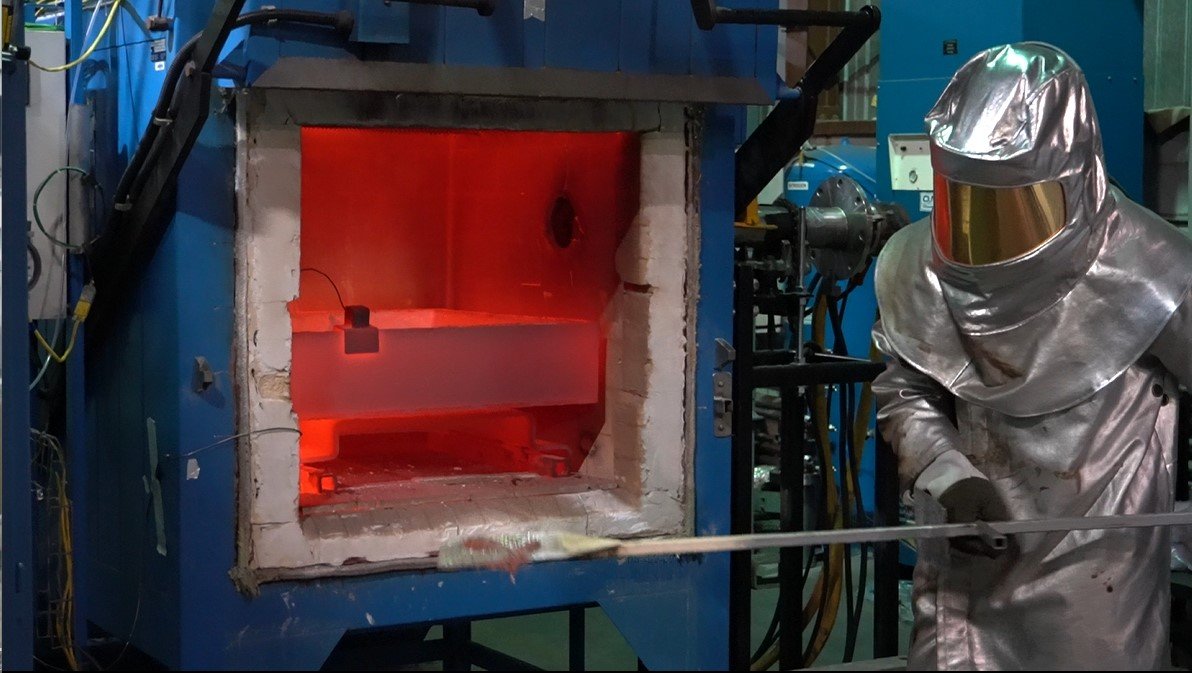 Figure 1: An engineer removes metal from a furnace during PyroGenesis’ tests using plasma torches within an aluminum melting furnace supplied by its client Constellium.