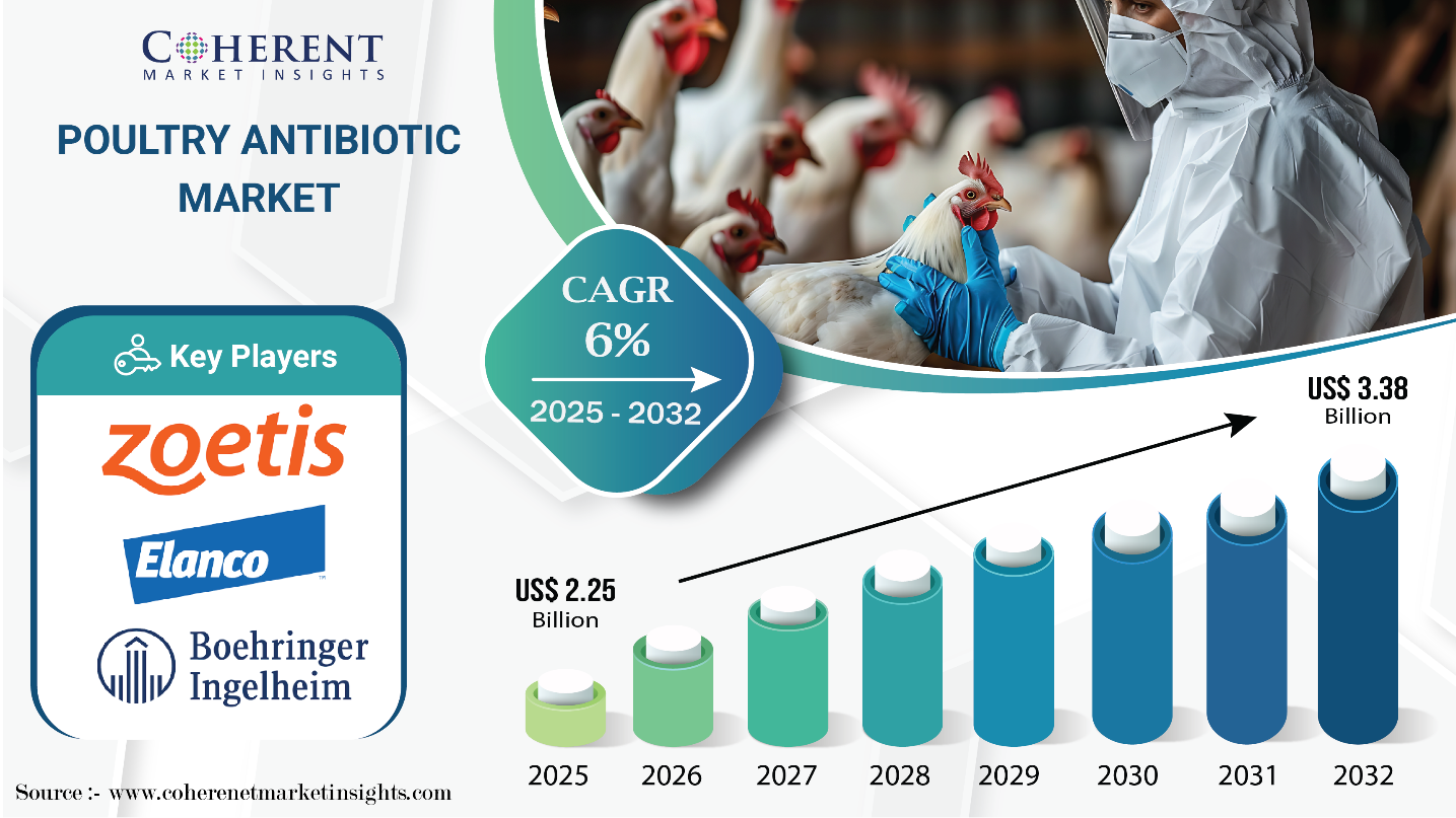 According to Coherent Market Insights (CMI), the global poultry antibiotic market size is projected to grow steadily, reaching USD 2.25 Bn in 2025 and USD 3.38 Bn by 2032.