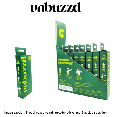 unbuzzd™ ready-to-mix powder sticks are available in 3-pack, 8-pack, and 18-pack formats at amazon.com and unbuzzd.com.