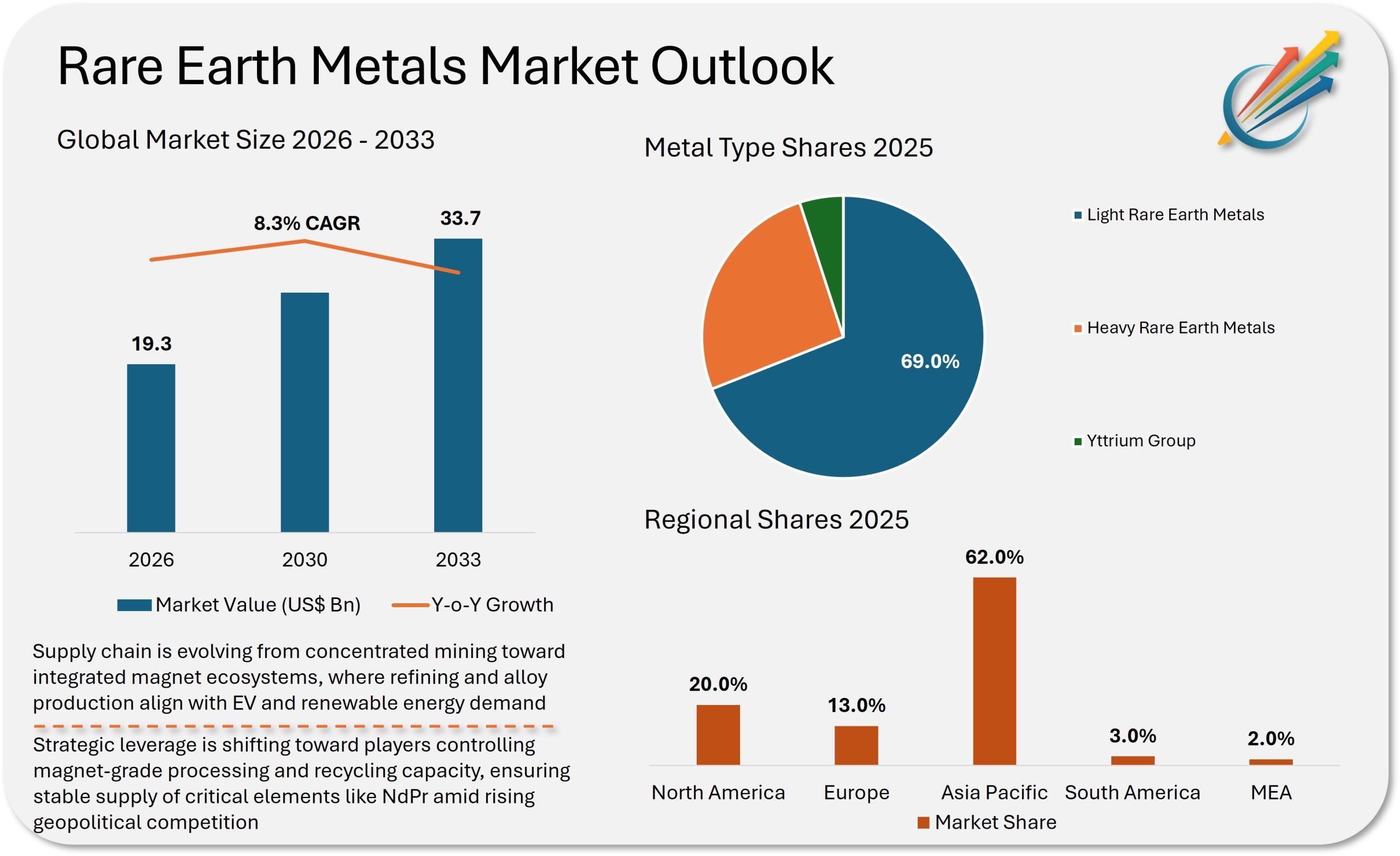 Mayfair, London, March 09, 2026 (GLOBE NEWSWIRE) — The rare earth metals market is becoming strategic as global industries transition toward electrification, renewable energy systems and advanced electronics manufacturing. Rare earth metals market is estimated to be valued at USD 19.3 billion in 2026 and is forecast to reach USD 33.7 billion by 2033, expanding at a CAGR of 8.3% over 2026 and 2033. Escalating export controls are forcing a massive strategic shift toward localized extraction and advanced recycling across the critical minerals ecosystem. With the global rare earth metals market pivoting rapidly away from monopolized supply chains, Western government interventions including multi-billion-dollar equity stakes are transforming the industry.